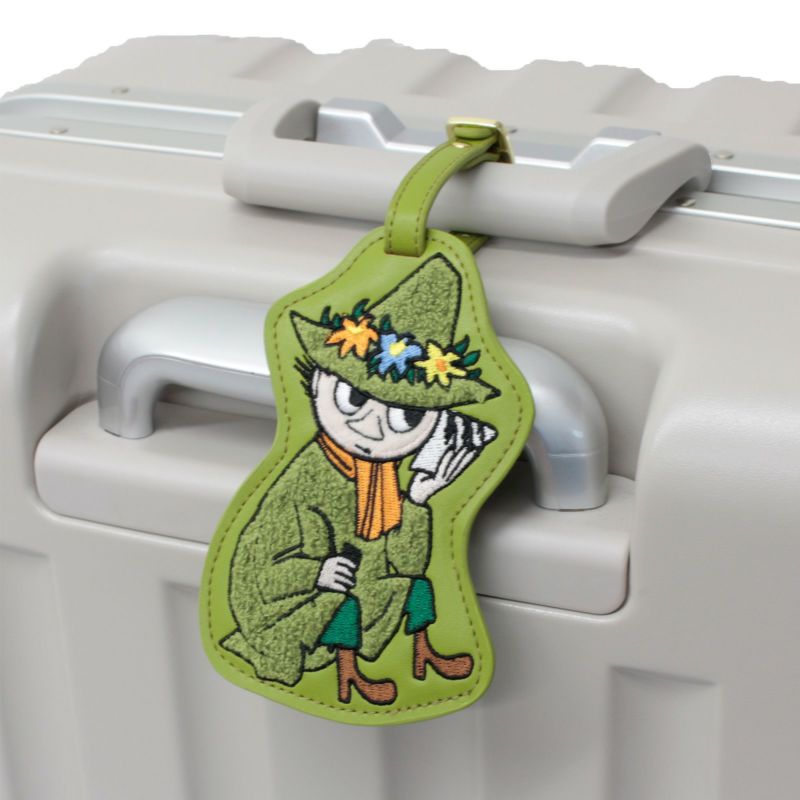 ムーミン、ニョロニョロ、スナフキン、リトルミイの形をしたラゲッジタグ。サガラ刺繍でフワっとした手触り。