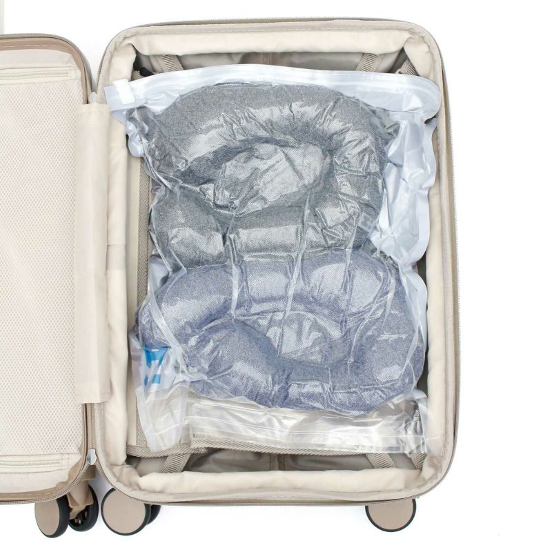 ただ、座るだけ!約3秒で圧縮できる圧縮袋!「逆止弁構造」で空気の戻りを防ぎ、表面は「エンボス加工」が施されているので中身が出し入れしやすく、収納も簡単!内側に、抗菌効果のあるノバロン添加PE樹脂加工を施しているため安心。片面は透明なので中に入っているものが一目でわかります。大きいサイズのスーツケースにぴったりサイズです。(スーツケースの仕様によって異なりますので、事前にご確認ください)出張、旅行、アウトドアなど様々なシーンで活躍する便利品です。かさばる衣類の収納におすすめ。安心の日本製です。