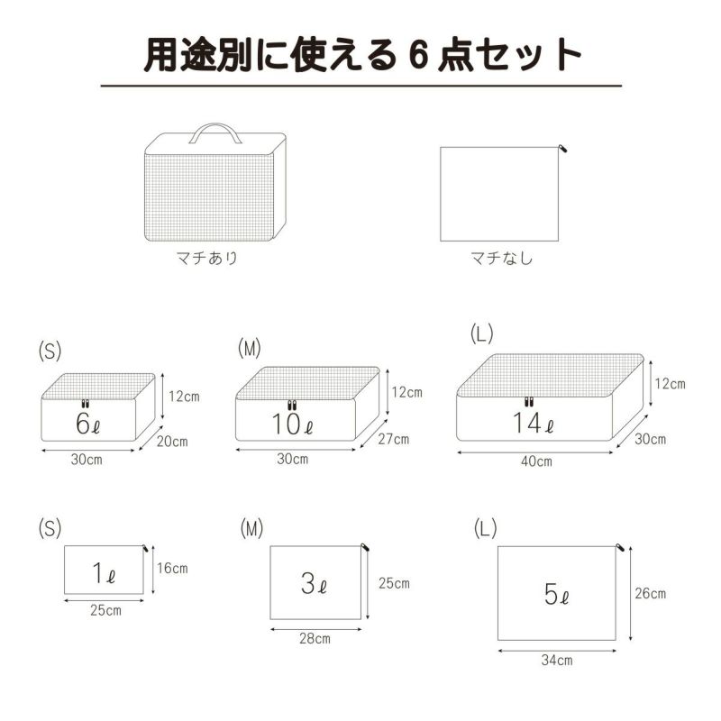 色々な用途に使えるトラベルポーチ6点セットです。マチ付きオーガナイザーが3点、マチ無しのポーチ3点入りの合計6セット。オーガナイザーは、厚みのある衣類を入れるのに最適で、フロント部はメッシュタイプとなり中身がすぐに分かりつかいやす。ポーチは、化粧品や理美容品、小物アイテムの収納に最適。