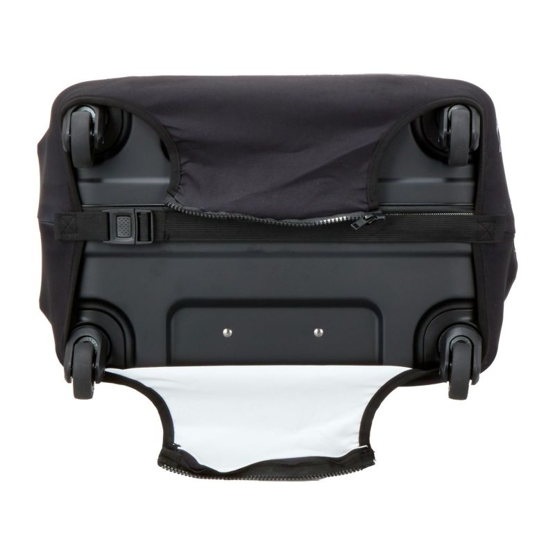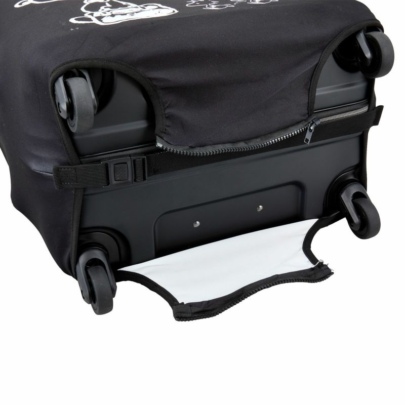 スーツケースカバーの装着方法は簡単!スーツケースにカバーをかぶせて底面まで伸ばし、底面でカバーに付いているバンドを留めて、カバーのファスナーを閉めるだけ。