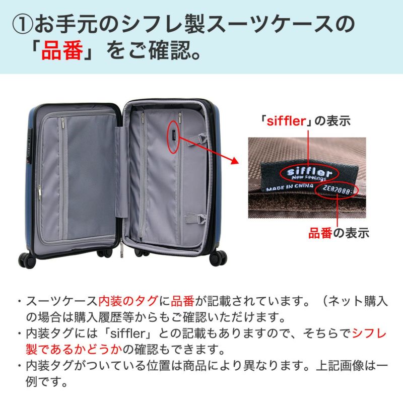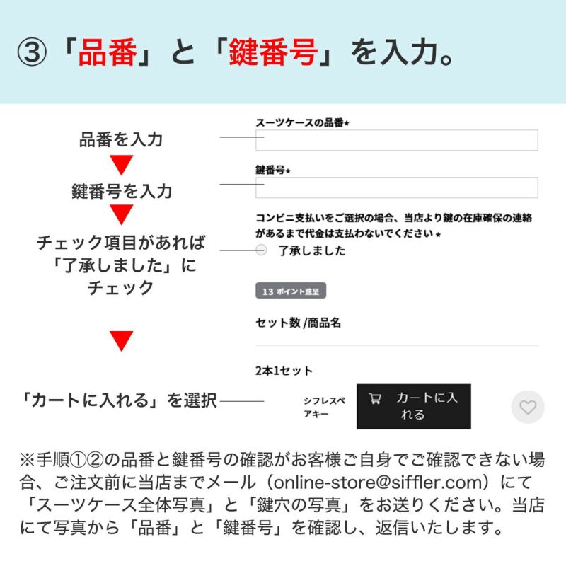 ※①②がお客様ご自身でご確認できない場合、ご注文前に当店までメール(online-store@siffler.com)にて「スーツケース全体写真」と「鍵穴の写真」をお送りください。当店にて写真から「品番」と「鍵番号」を確認し、返信いたします。