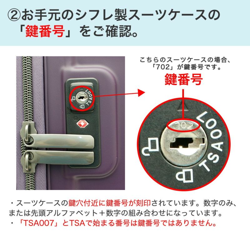 ●当店でのシフレ製スーツケースの新規購入と同時に予備でスペアキーも購入したい場合、お客様のほうで「品番」と「鍵番号」をご確認いただく必要はございません。当店にて、発送するスーツケースの品番と鍵番号を確認し、スペアキーを同梱いたします。(この場合、品番と鍵番号の入力欄には「スーツケースと同時購入」とご入力ください。)