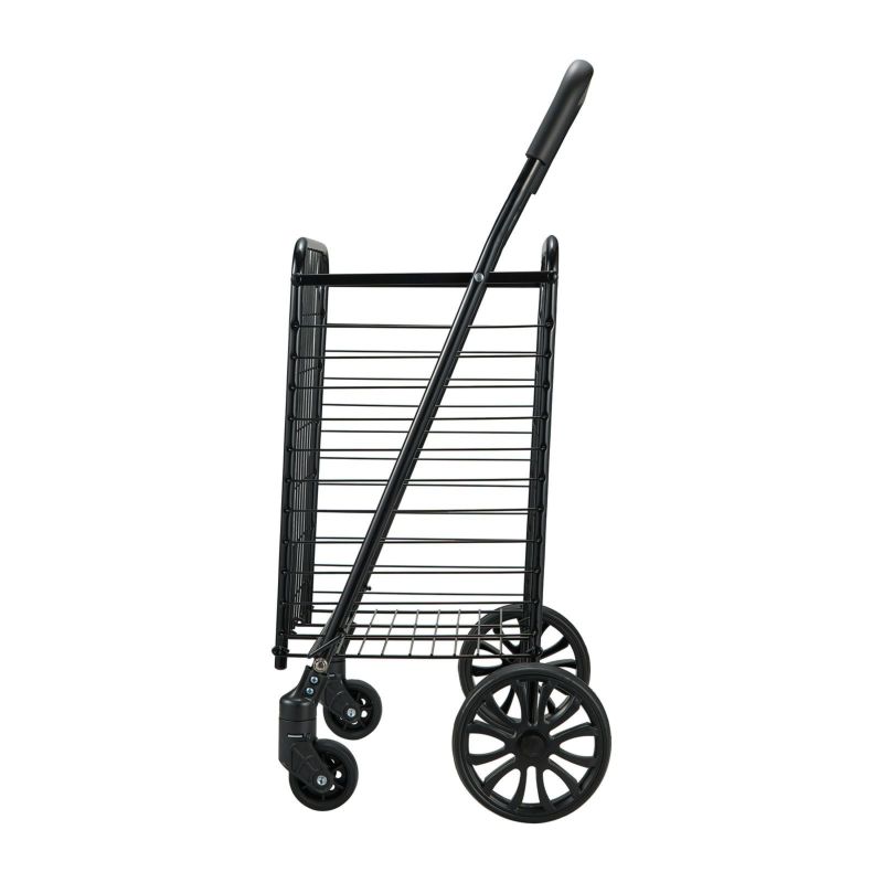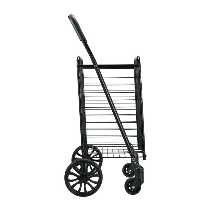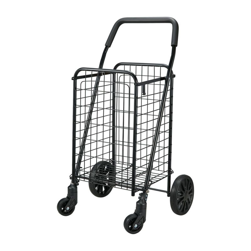 お買い物やアウトドア、スポーツ、レジャーに活躍するスチール製のカゴ付きワイヤーカート。キャスターが4輪付いており、前輪キャスター2つは360度回転するのでスムーズな方向転換が可能。折りたたむことができ、薄く平らになるため、収納の際に場所を取りません。
