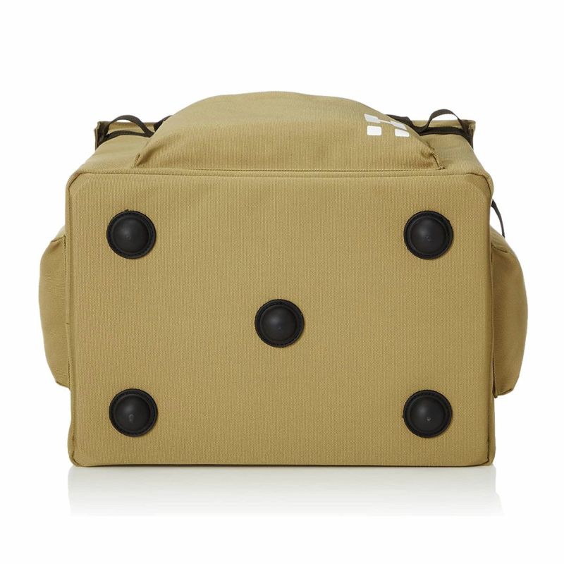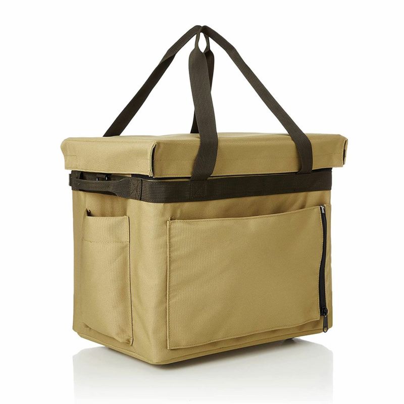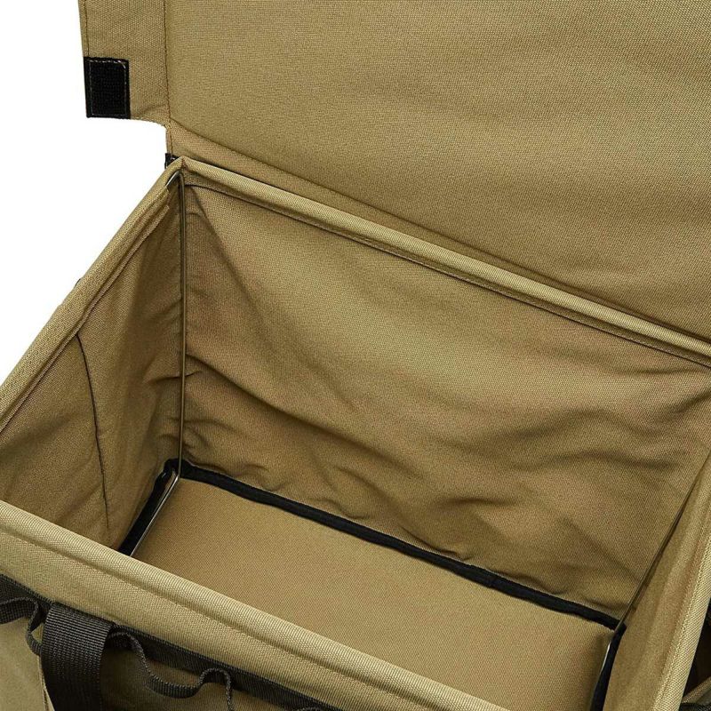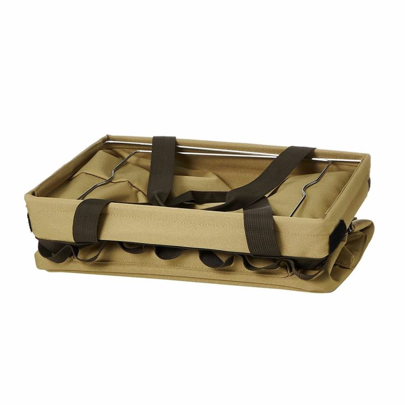 薪入れやキャンプギアを折りたたんで便利に収納できるワンタッチバケット。両側のフレームを立ち上げるとバケットとして自立し、使わない時はフレームを畳めばコンパクトにすることができます。背面はキャリーカート等に装着できるようにキャリーバー通しが付いており、キャリーバー通しのファスナーを開けることで重い荷物が入っているバケットでも簡単にキャリーカート等に着脱することができます。