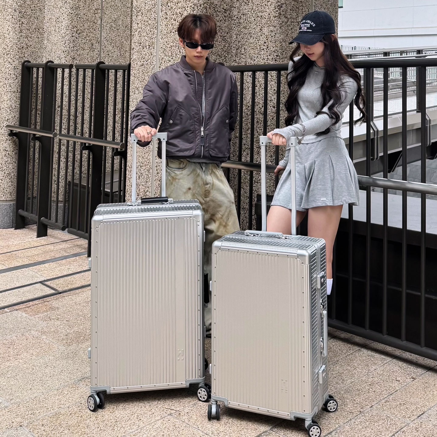 高級感のある美しい見た目と頑丈さが魅力のアルミニウムボディのスーツケース。スタイリッシュなシルバーカラーで存在感抜群。