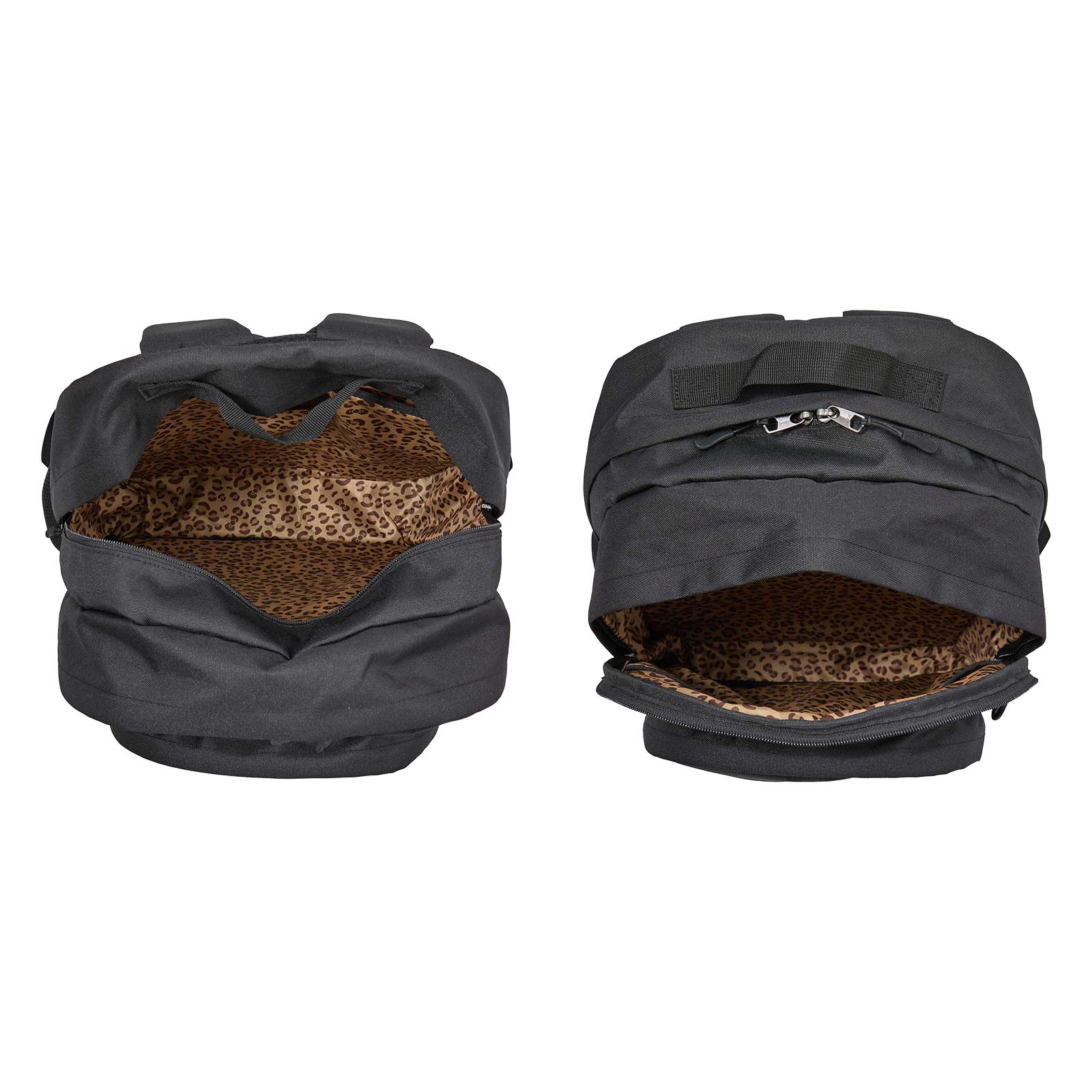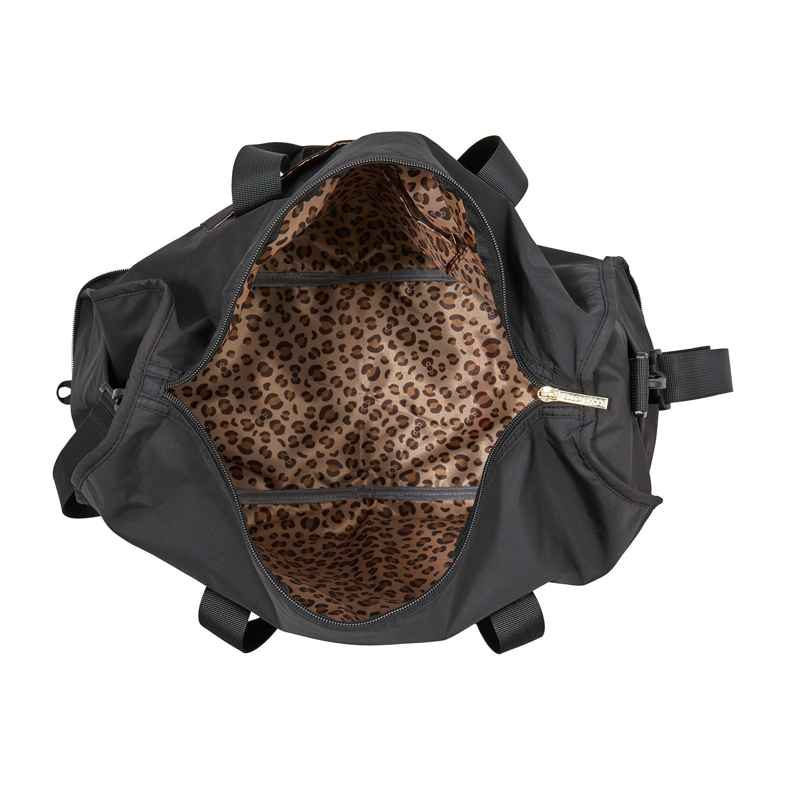 バッグの開口部はファスナーで閉じられるので中身がこぼれる心配がありません。内装ポケット付き。内装の柄はヒョウ柄で、よく見るとハローキティのリボンが隠れています!