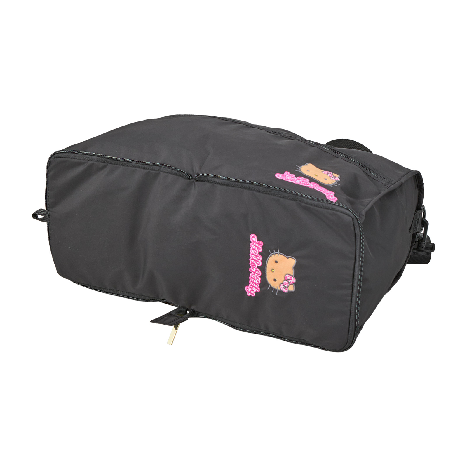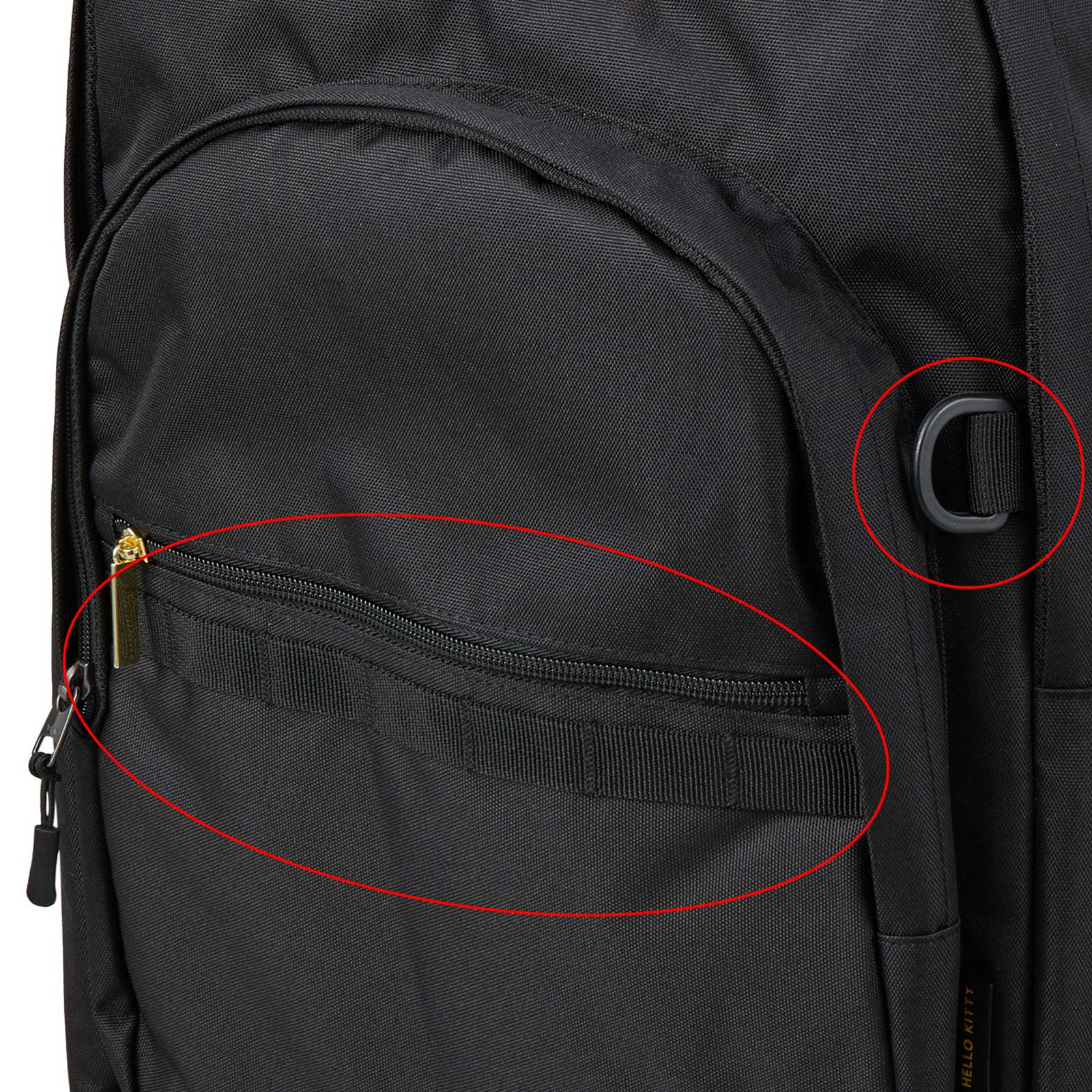 日焼けデザインのハローキティのお顔と、バックパックのブラック生地に映えるピンクのロゴが大人かわいいデザイン。