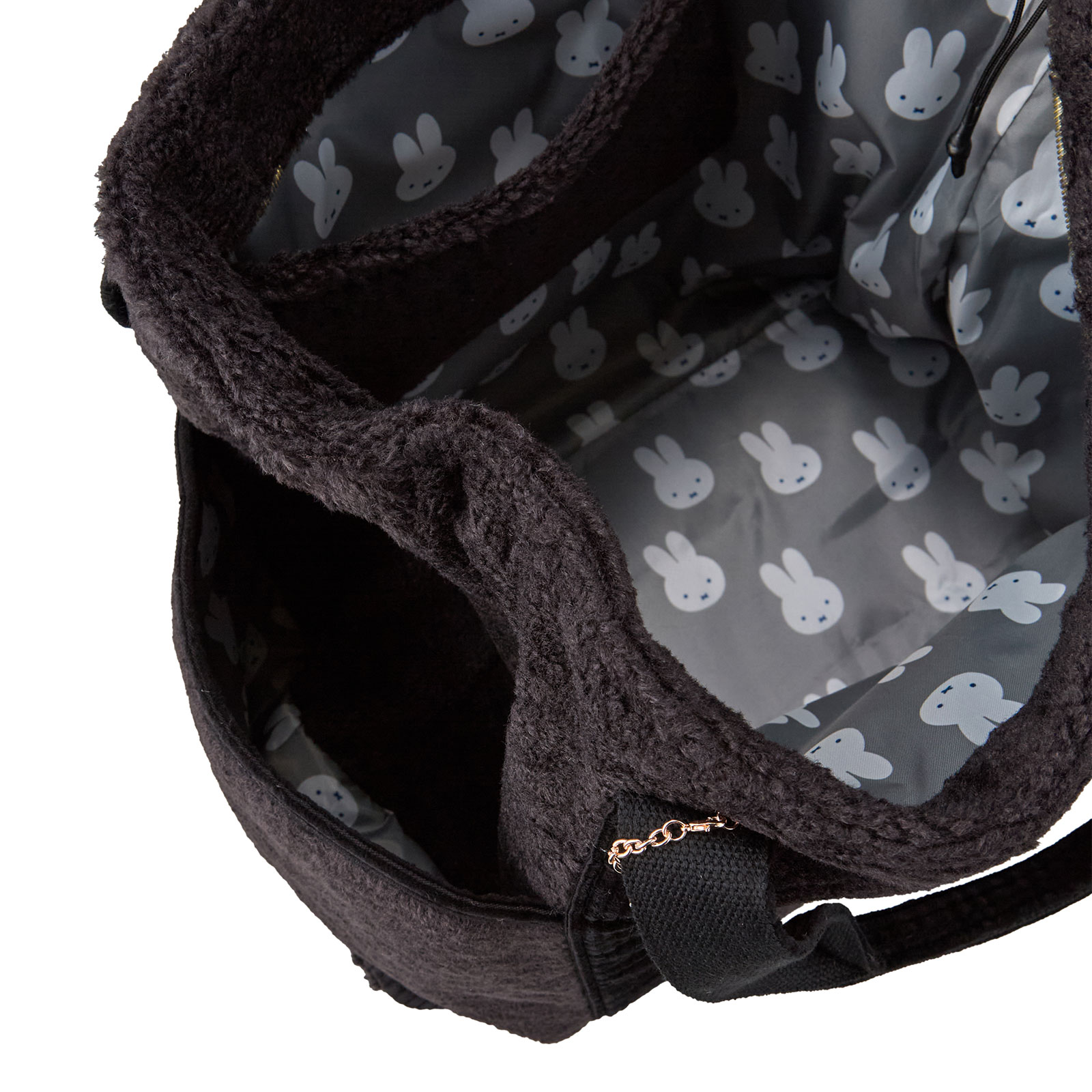ファスナートップはミッフィーのお顔の形をしています。また、バッグ側面にはひょっこりと覗くミッフィーのお顔のタグがついています。
