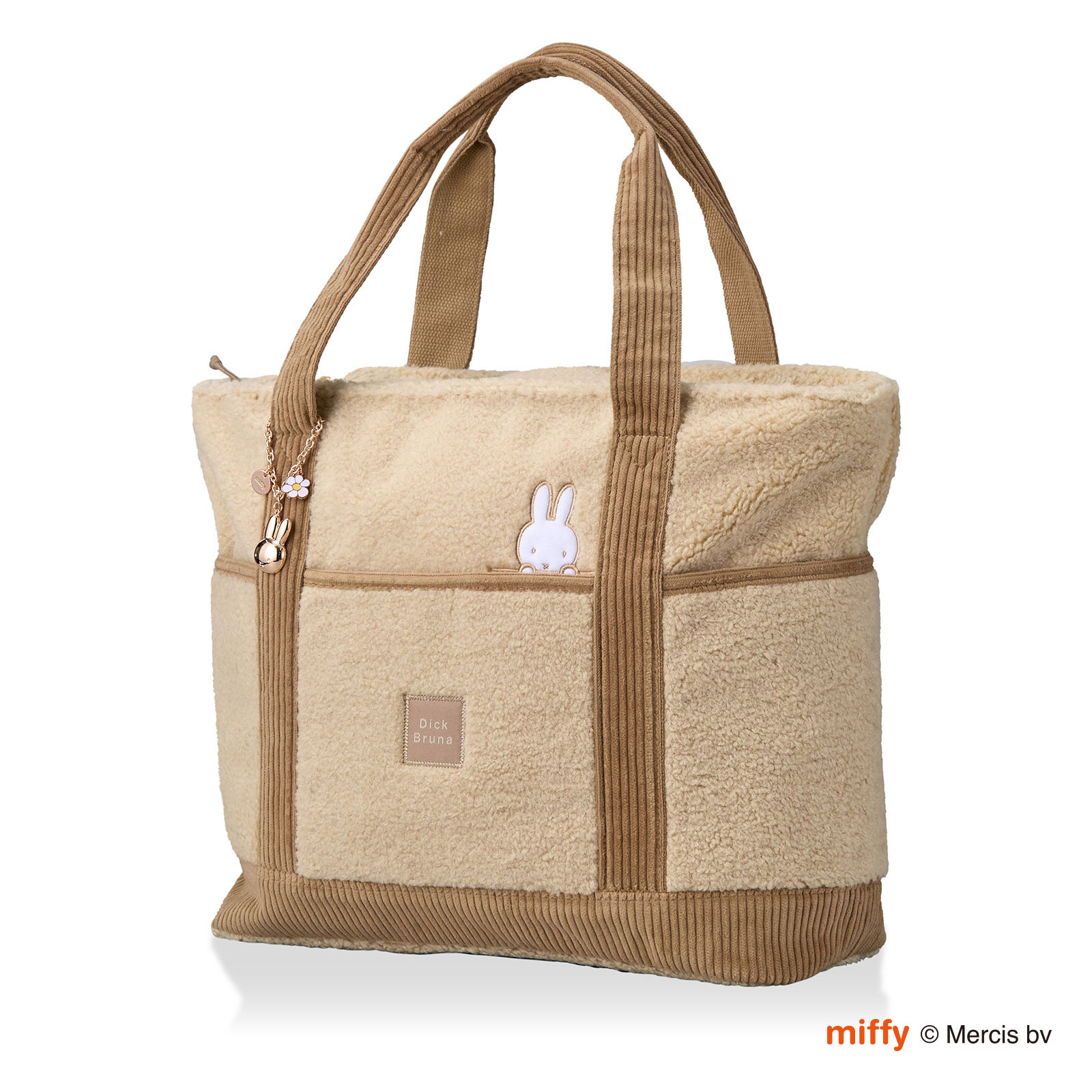 miffyと刻印されたチャーム付き。また、ポーチ側面にはひょっこりと覗くミッフィーのお顔のタグがついています。