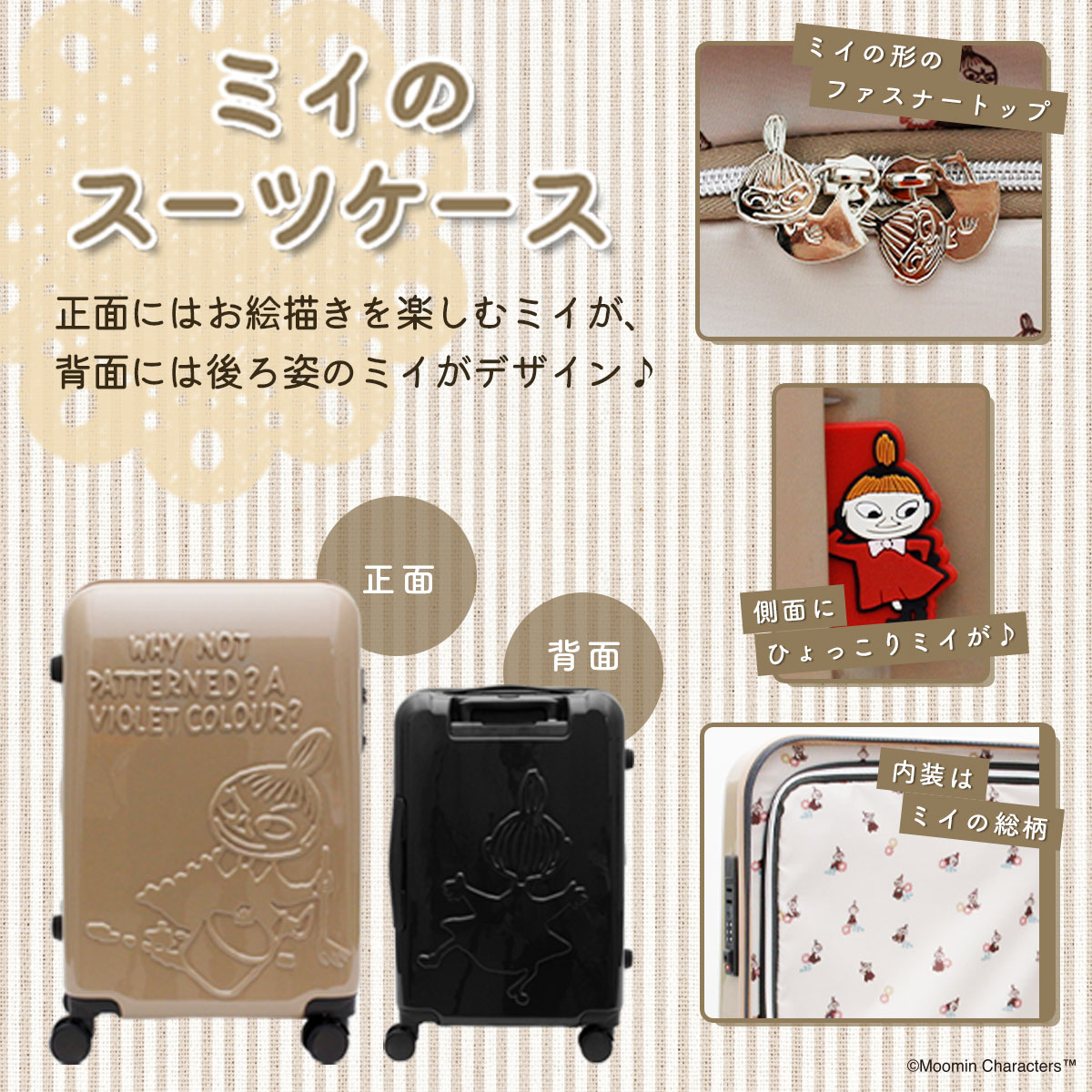 ミイのジッパータイプのスーツケースSとMの2サイズが登場!Sサイズは容量が約30Lで宿泊目安約1~3泊、Mサイズは容量が約3~5泊で宿泊目安約3~5泊です。さらにSサイズは機内持ち込みが可能なサイズとなっております。